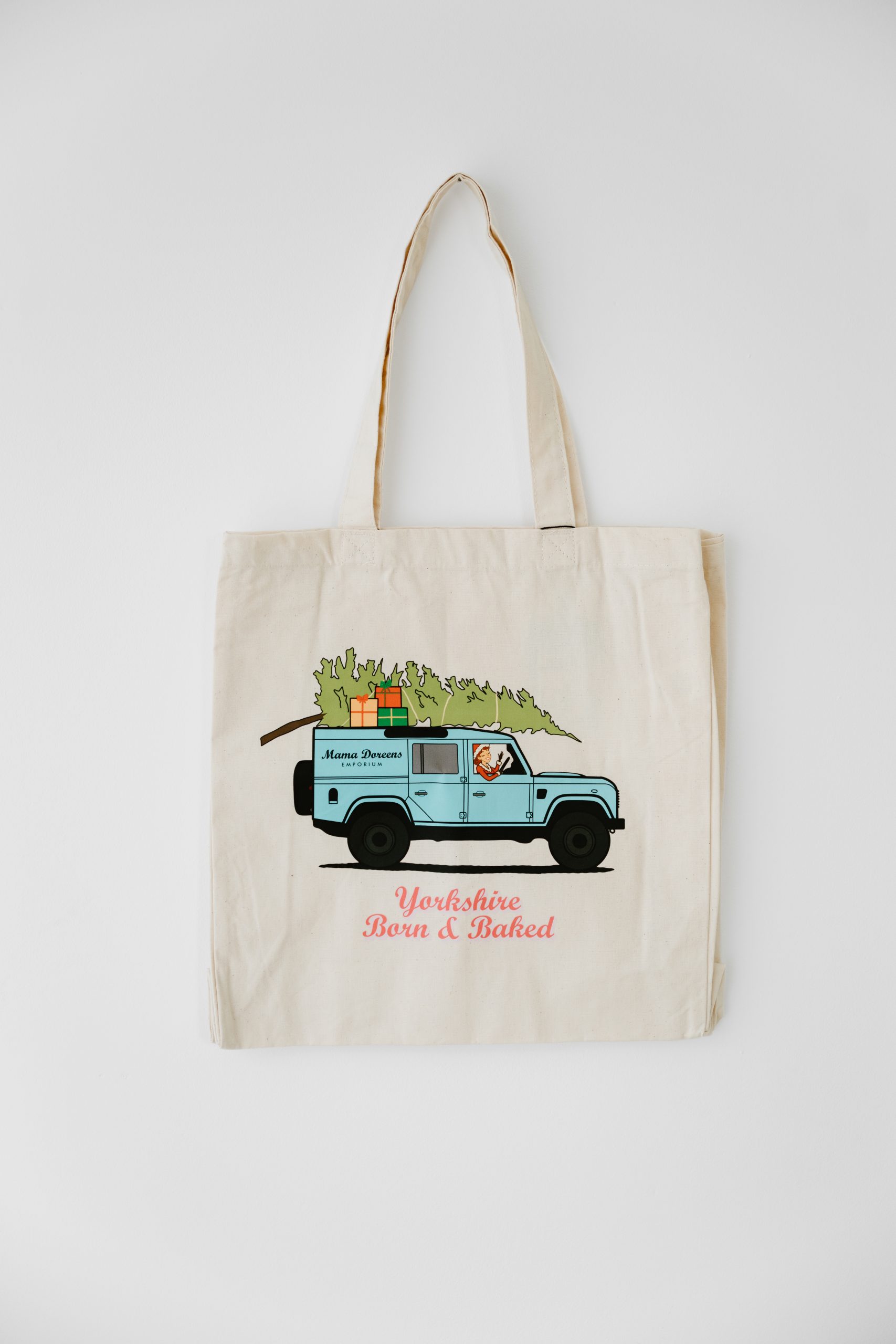 Mama Doreen on a joyful winter drive, tree on the roof of her Land Rover and the phrase “Yorkshire Born & Baked” beneath. A playful celebration of Yorkshire spirit and Christmas cheer in one delightful design.